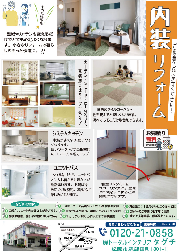 Copyright © 2026 (有)トータルインテリア タグチ All Rights Reserved. 松阪市駅部田町1801-1 0598-21-0858